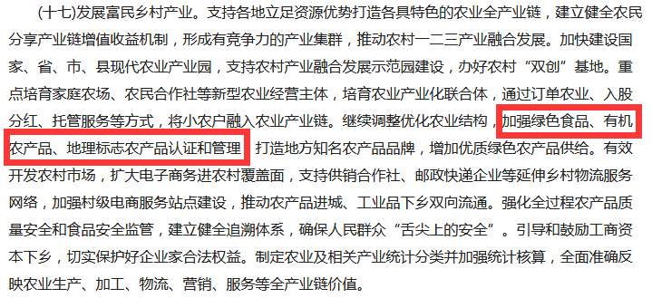 文件中的第十七點(diǎn),提到了“加強(qiáng)綠色食品、有機(jī)農(nóng)產(chǎn)品認(rèn)證和管理”