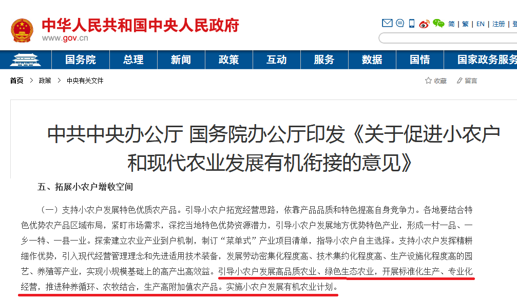 其中意見(jiàn)描述:“引導(dǎo)小農(nóng)戶發(fā)展高品質(zhì)農(nóng)業(yè)、綠色生態(tài)農(nóng)業(yè),開(kāi)展標(biāo)準(zhǔn)化生產(chǎn)、專(zhuān)業(yè)化經(jīng)營(yíng),推進(jìn)種養(yǎng)循環(huán)、農(nóng)牧結(jié)合,生產(chǎn)高附加值農(nóng)產(chǎn)品。實(shí)施小農(nóng)戶發(fā)展有機(jī)農(nóng)業(yè)計(jì)劃。”