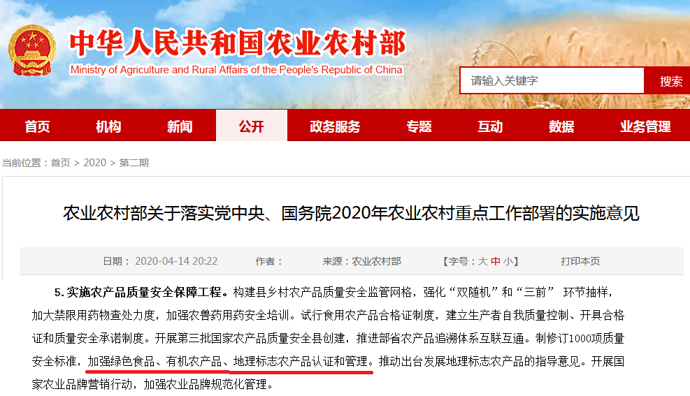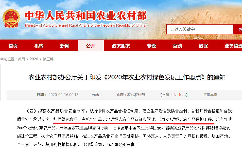 通知對(duì)于“加強(qiáng)綠色食品、有機(jī)農(nóng)產(chǎn)品、地理標(biāo)志農(nóng)產(chǎn)品認(rèn)證和管理,實(shí)施地理標(biāo)志農(nóng)產(chǎn)品保護(hù)工程,培育打造200個(gè)地理標(biāo)志農(nóng)產(chǎn)品。”的描述,要全面提高農(nóng)產(chǎn)品質(zhì)量安全水平。