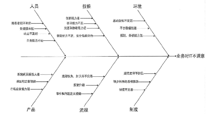 業(yè)務(wù)對(duì)IT服務(wù)不滿意的因素可以歸結(jié)在人、物、軟能力、外部環(huán)境、流程和規(guī)則制度六個(gè)方面。在對(duì)各種影響因素進(jìn)行分析后,進(jìn)一步尋找服務(wù)不滿的真正原因,繪制出魚骨圖。